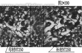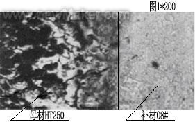 3.1.2 將焊補處進行打磨、拋光,制作金相分析試片,金相組織如圖1、圖2。圖1左邊為母材HT250,右邊為0.8#補材,圖2左邊為母材HT250,右邊為HT250鐵屑補材。焊補處未見明顯分界線、過渡區(qū)域微小、焊補點附近未見碳化物析出、焊補處金屬組織致密,未見裂紋的產(chǎn)生。結(jié)論:宏觀檢測,焊補點附近及整個試棒常溫,焊補點金屬顏色與母材相同,補材為0.8#的焊補點比母材更致密,補材為同材質(zhì)的焊補點與母材致密度相同,金相組織分析:無裂紋、周邊金相組織未改變、無內(nèi)應(yīng)力,未出現(xiàn)硬化、軟化現(xiàn)象。