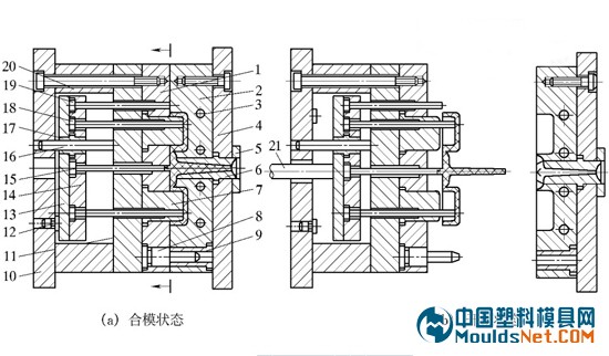 19—復(fù)位桿;20—墊板;21—注射機(jī)頂桿